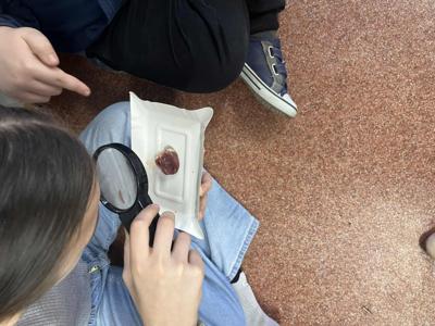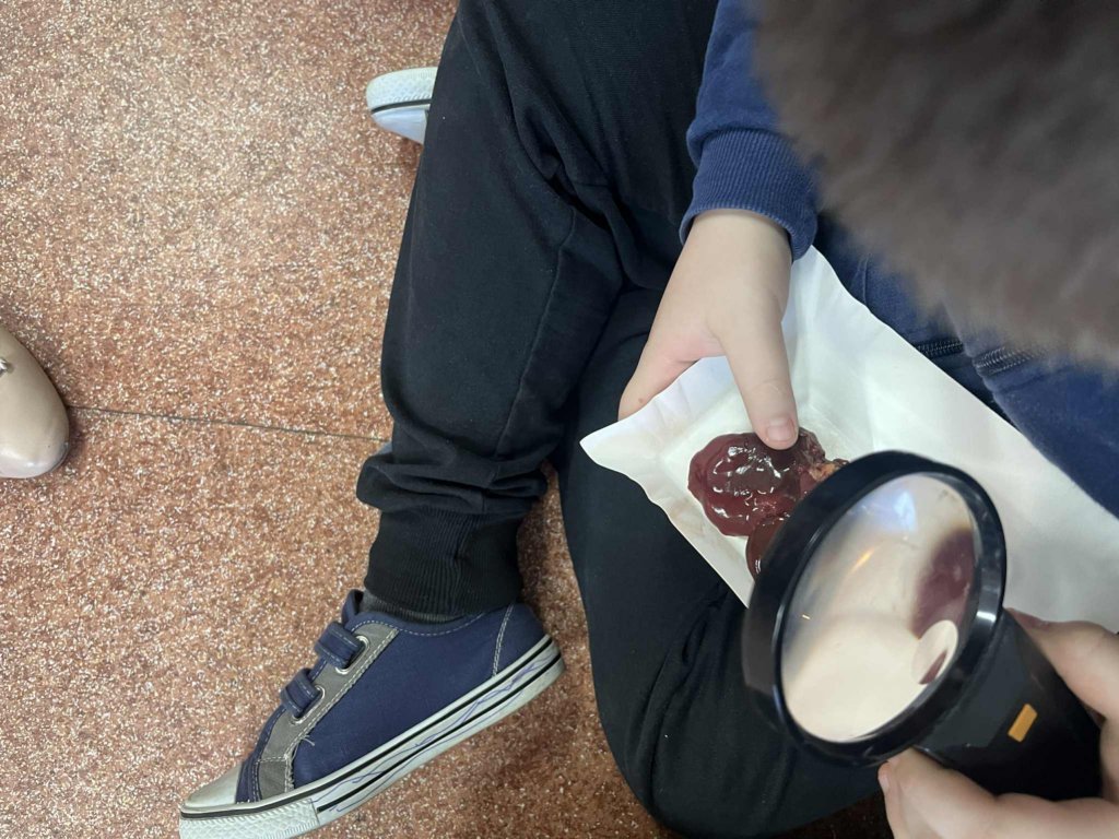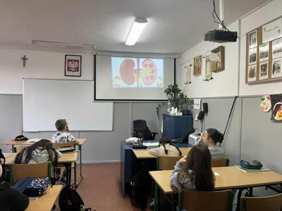 Uczniowie klasy IV podczas zajęć z edukacji zdrowotnej, dotyczącej budowy ludzkiego organizmu, mieli możliwość z bliska przyjrzeć się budowie serca, żołądka czy wątroby. Pod lupą lepiej było widać konstrukcję poszczególnych narządów – oczywiście były to drobiowe organy. Uczniowie z ogromną ciekawością, korzystając z lupy, przyglądali się budowie mięśnia sercowego, odnajdywali komory serca czy opisywali budowę żołądka. Podsumowaniem zajęć był quiz dotyczący tematyki lekcji.